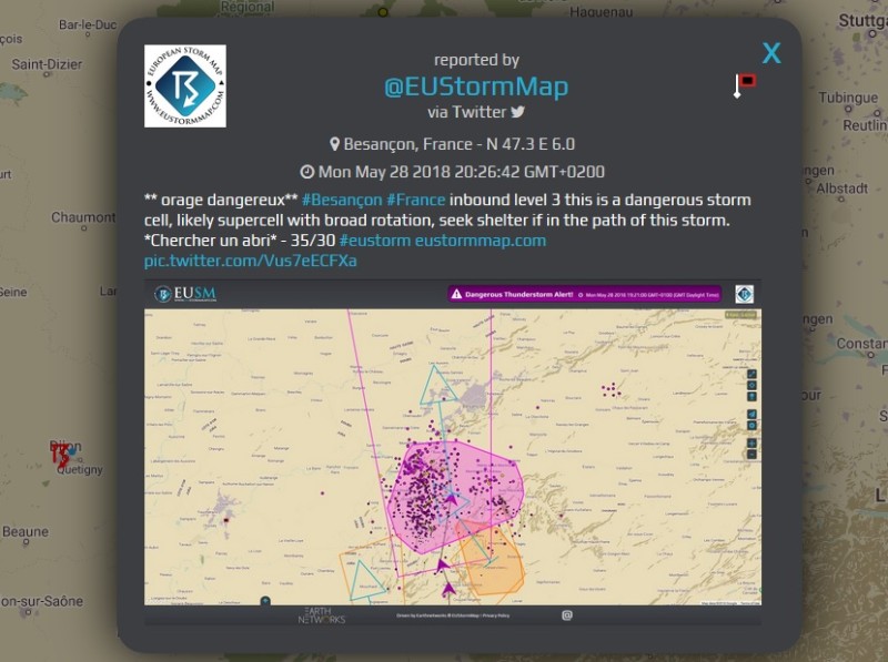 Cet orage violent a été classé comme très dangereux par EU Storm Map qui a tout de suite prévenu avec un message sans équivoque « chercher un abri ».