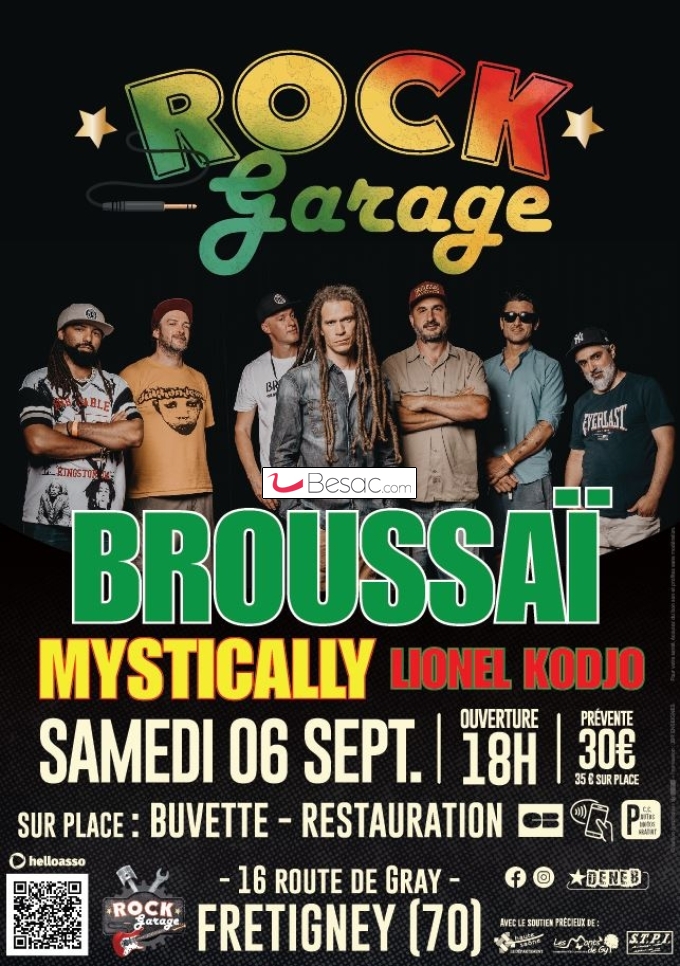 - BROUSSAÏ, la figure incontournable du reggae francophone, enflammera la scène du Rock Garage avec son énergie communicative et ses textes engagés : une invitation au partage, à la réflexion et à la fête !
